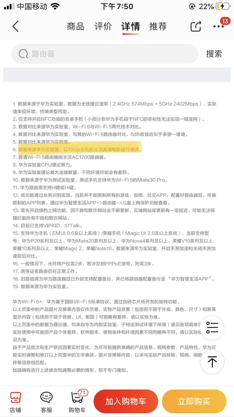 近日再看它的产品说明时,华为已悄然改了数据,它很鸡贼地把原来小字部分的“10G左右的主流高清电影”中的“10G”,改成了“10Gb”!