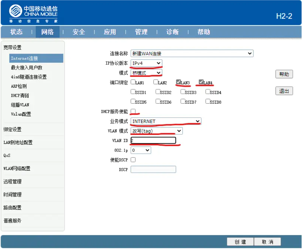 2,新建WAN连接,“模式”选择“桥模式”,“端口绑定”选择未被绑定的端口(LAN1为已有internet连接,LAN2为IPTV),关闭DHCP,业务模式选择internet,VLAN模式选择“改写(tag)”,VLAN ID填入和现有internet连接相同的VLAN ID: