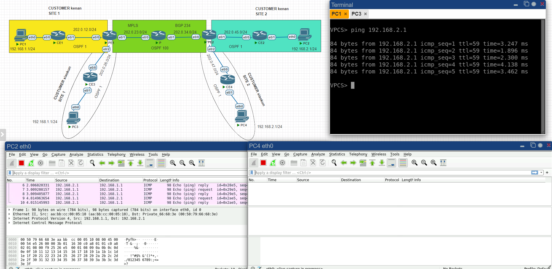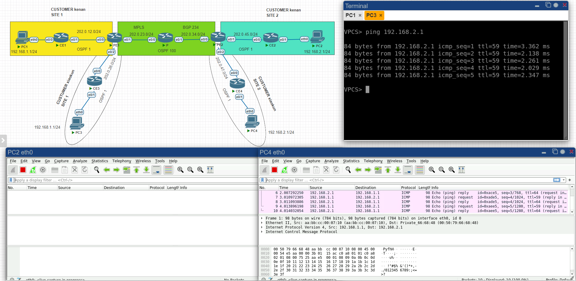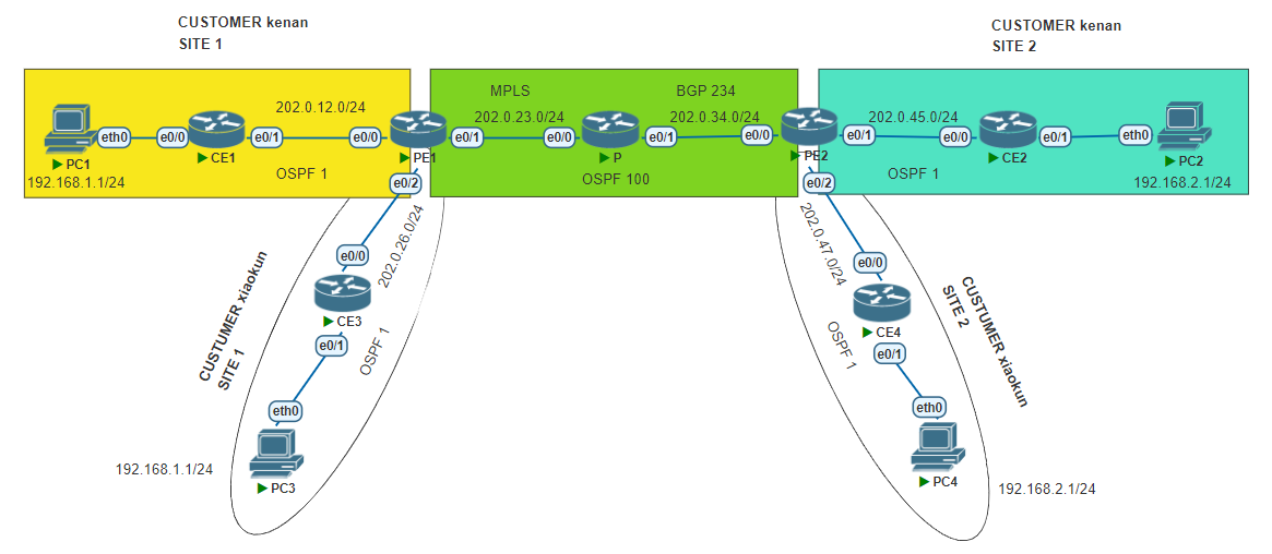 router ospf 1 vrf kenan #配置PE和CE之间的动态路由(需在完成vrf配置之后,不然无法启动进程)
